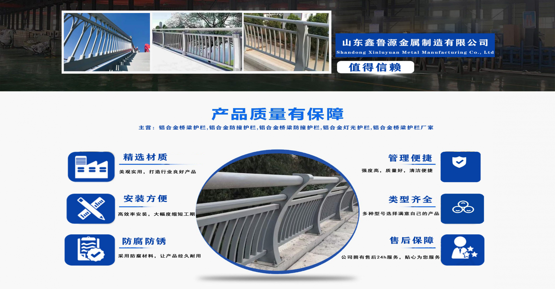 山東鑫魯源金屬制造有限公司主要經(jīng)營:鋁合金橋梁護(hù)欄,鋁合金防撞護(hù)欄,鋁合金橋梁防撞護(hù)欄,鋁合金燈光護(hù)欄,不鋁合金橋梁護(hù)欄廠家,環(huán)波梁橋梁護(hù)欄,環(huán)波梁防撞護(hù)欄。質(zhì)量可靠、經(jīng)濟(jì)實(shí)用的顯著特點(diǎn)。公司為客戶提供可靠售后保障,堅(jiān)持“以品質(zhì)立足、服務(wù)求發(fā)展”,愿與各界朋友精誠合作、攜手發(fā)展!  服務(wù)優(yōu)勢:真誠的服務(wù)理念、完善的服務(wù)體系。公司專業(yè)力量充足;工程案例眾多、從業(yè)經(jīng)驗(yàn)豐富;公司以可靠質(zhì)量的產(chǎn)品,合理的價格,完善的售后服務(wù),能夠滿足市場各個企業(yè)的需求。  企業(yè)精神:執(zhí)著追求 持續(xù)創(chuàng)新執(zhí)著追求,就是堅(jiān)持不懈、堅(jiān)定從容,專注于自己的事業(yè),把能做的事情做好,不斷克服困難、把握機(jī)遇,贏得未來。  持續(xù)創(chuàng)新,就是生命不息、創(chuàng)新不止,通過持續(xù)實(shí)施技術(shù)創(chuàng)新、管理創(chuàng)新、市場創(chuàng)新,獲取持續(xù)的競爭優(yōu)勢。...